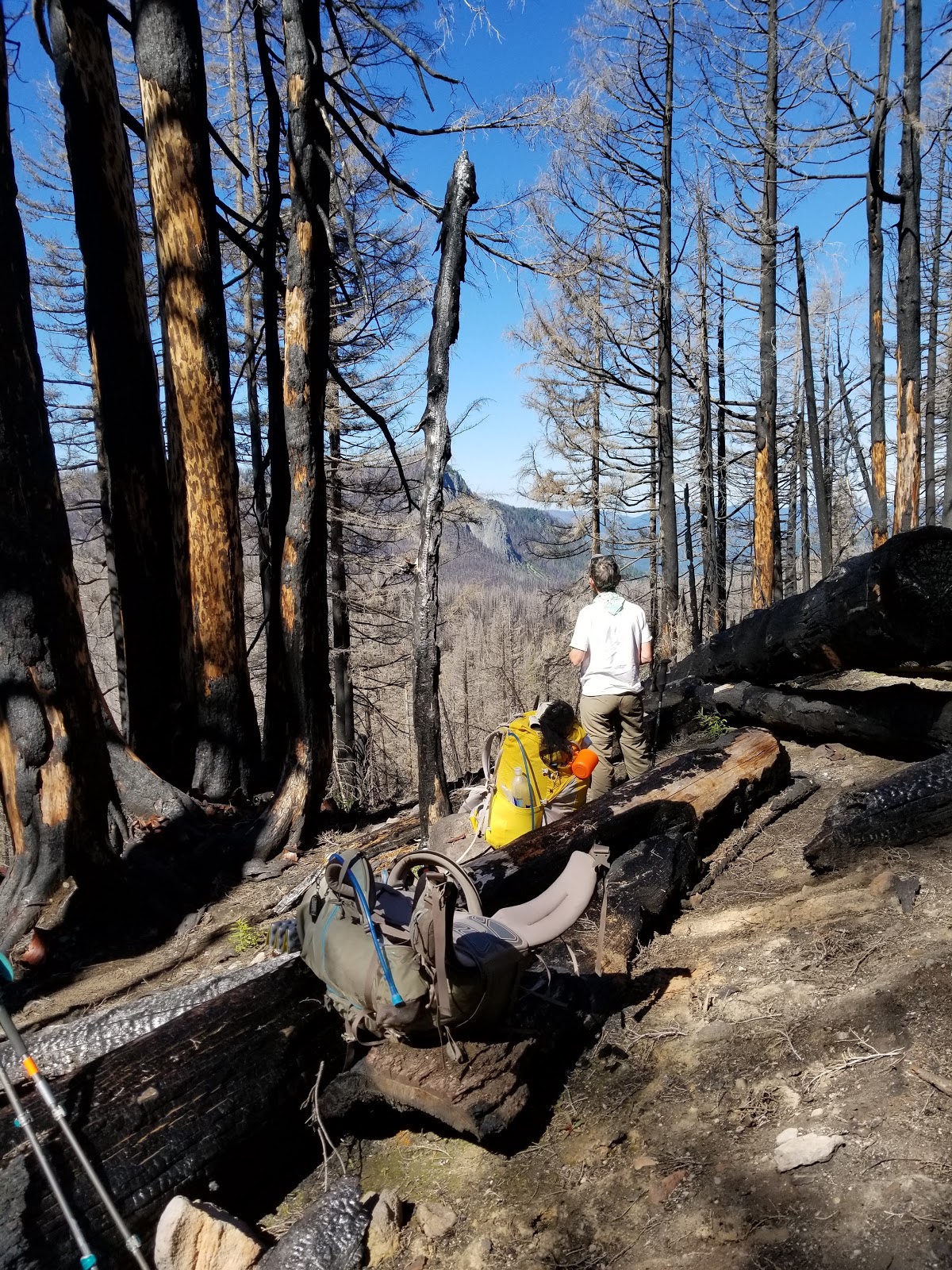 Then we start ascending once again and go through another burned area. This ascent seems difficult and we stop to catch our breath where a thru hiker is sitting and resting. We start to chat and I discover that this hiker is named Silver. And last year he hiked the Appalachian Trail with the Crawfords, known as The Family, who vlogged about their hike on the AT with their six children. I started watching their vlogs last year on You Tube. The vlog is called "Fight for Together," and it is wonderful.